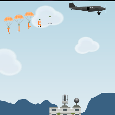 Bardzo pomysłowa gierka logiczna szkoląca dodatkowo nasze pisanie na klawiaturze. Z samolotów wyrzucane są literki wyposażone w spadochrony. Musimy wytypować wyraz przy pomocy klawiatury, a niewidoczny jego element odgadnąć, zanim cały napis doleci do gruntu.