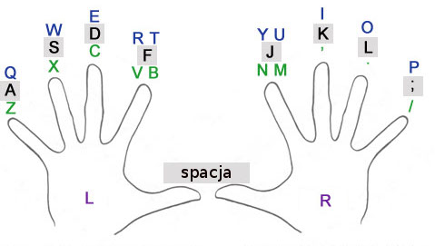 L (prawa dłoń). Warto od samego początku wyrabiać w sobie nawyk powracania na pozycję wyjściową po każdorazowym naciśnięciu jakiegoś przycisku. To jest bardzo ważne i niezbędne, aby szybko pisać bezwzrokowo.